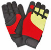 Modello con palmo in cuoio e tessuto ricoperto, dorso in poliestere rosso e giallo e chiusura con elastico e velcro.