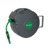 Avvolgitubo parete composto da: tubo da giardino di Ø 12,5 mm da 20 m di lunghezza, un tubo d'attacco di Ø 12,5mm da 1,5 m di lunghezza, una lancia regolabile, un giunto, un raccordo portagomma, una presa rubinetto, un attacco portatubo da muro con viti.
