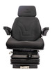Sedile modello Top completo per macchine agricole e da costruzione, dotato di sospensione pneumatica. Il rivestimento è in tessuto nero ed è completo di cuscini ergonomici avvolgenti in tessuto. Lo schienale è alto e il telaio è portante in lamiera.